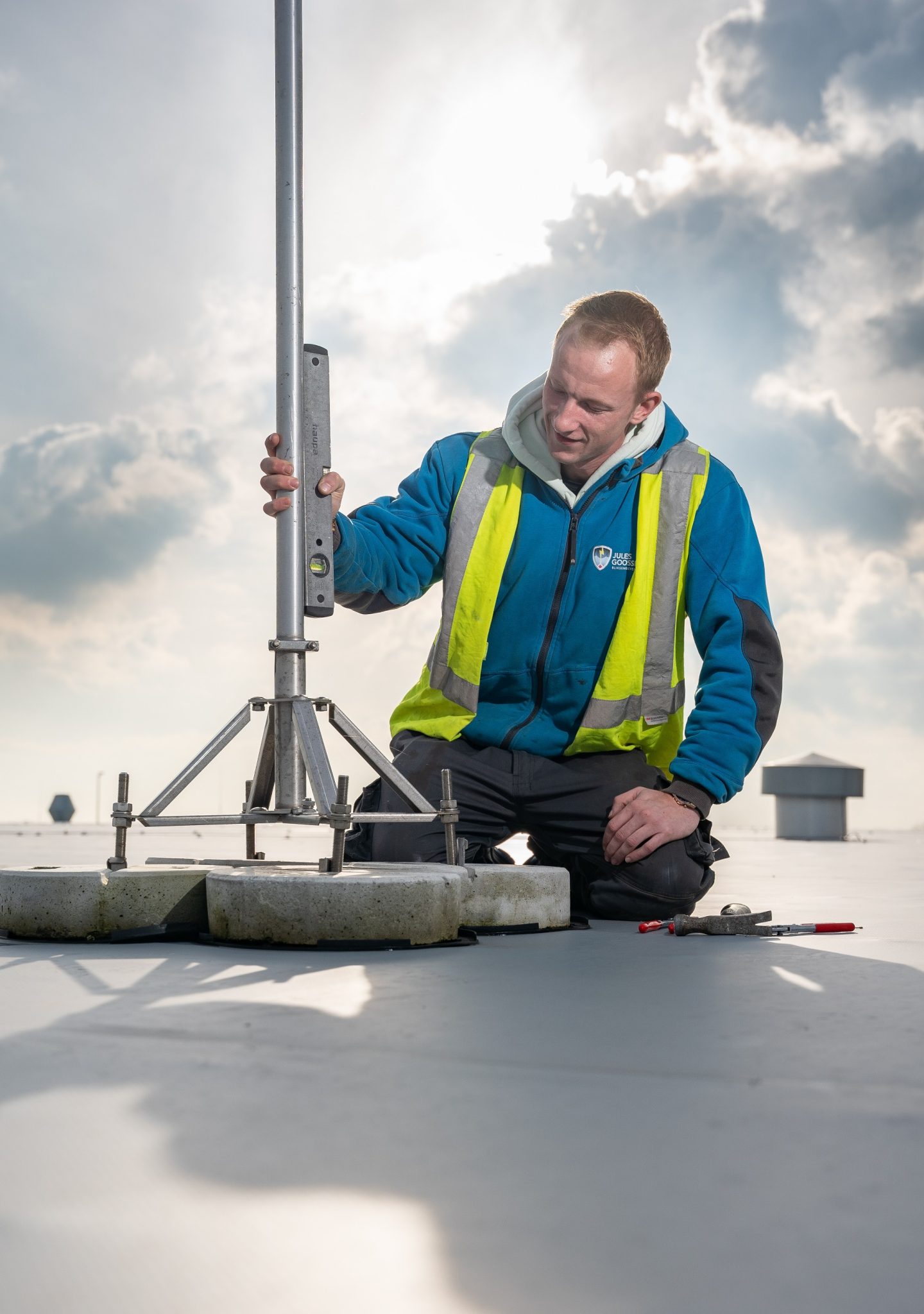 Het gehele dak van het pand, die onlangs casco is opgeleverd, is voorzien van verschillende bouwkundige objecten en PV-panelen; een gegeven dat het installeren net iets lastiger maakte.
